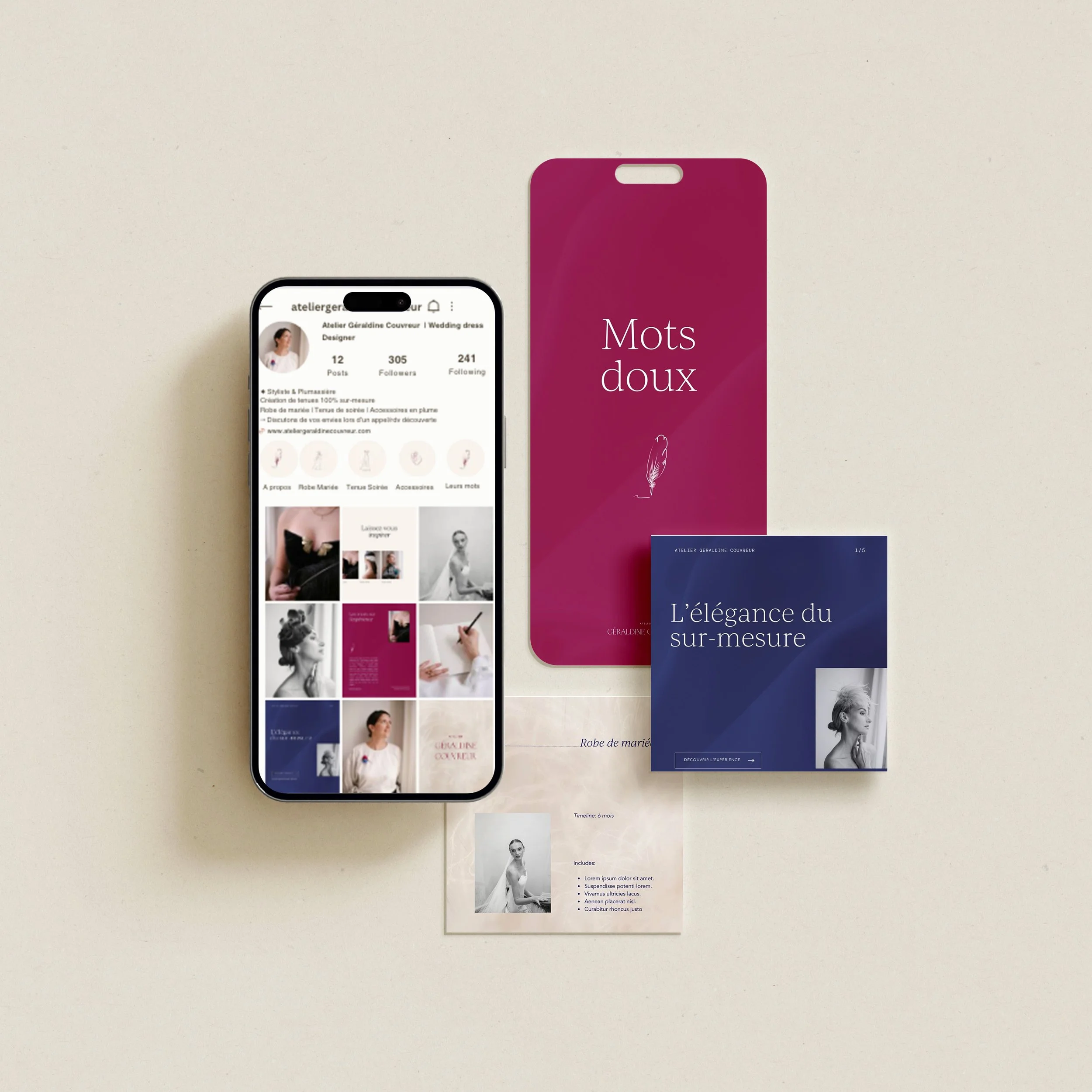 Cette identité visuelle s’inspire du geste artisanal de l’atelier : matières naturelles, textures douces et élégance du sur-mesure. Les typographies fines reflètent la délicatesse et le savoir-faire couture.